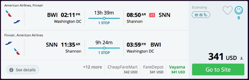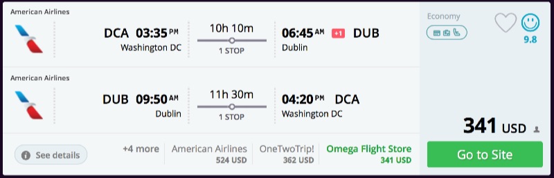 Amazing deal: Washington (DCA or BWI) to Ireland: Dublin or Shannon flight roundtrip as low as $341.