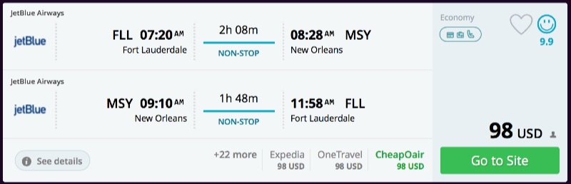 Amazing deal: Fort Lauderdale to New Orleans and vice versa flight, roundtrip as low as $98.