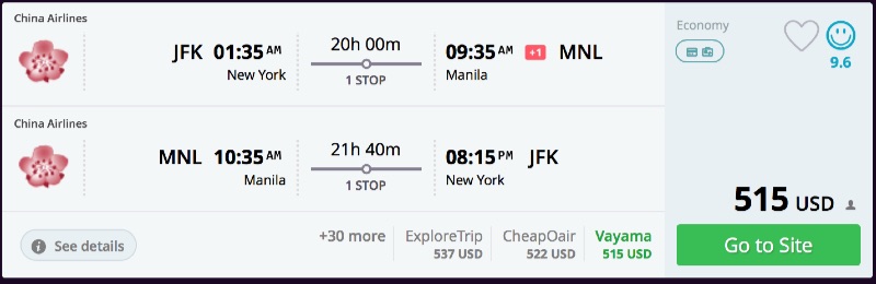 Amazing deal: New York to Manila, Philippines flights roundtrip as low as $515.
