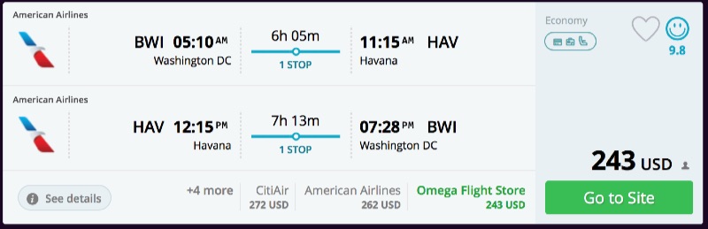 Baltimore to Havana, Cuba from $243 R/T [AA]