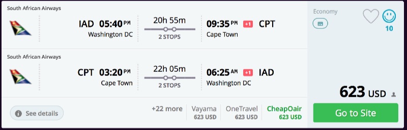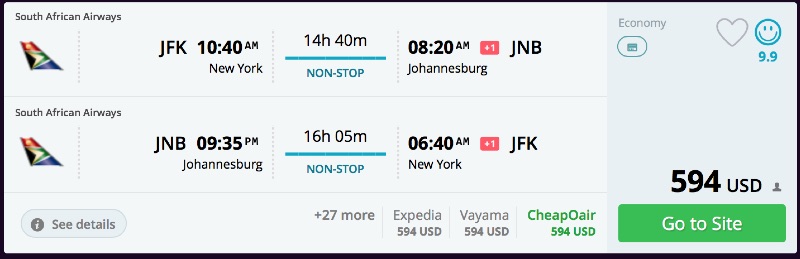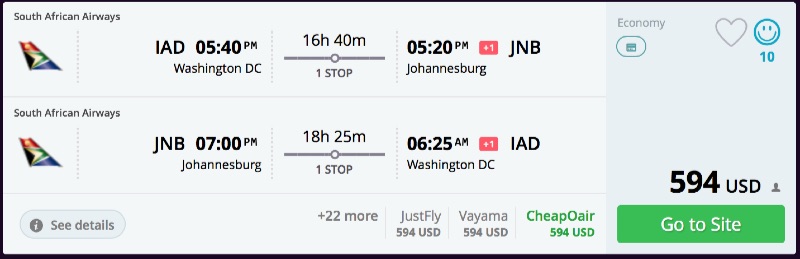 Amazing deal: New York or Washington DC to South Africa: Johannesburg or Cape Town flight roundtrip as low as $594.