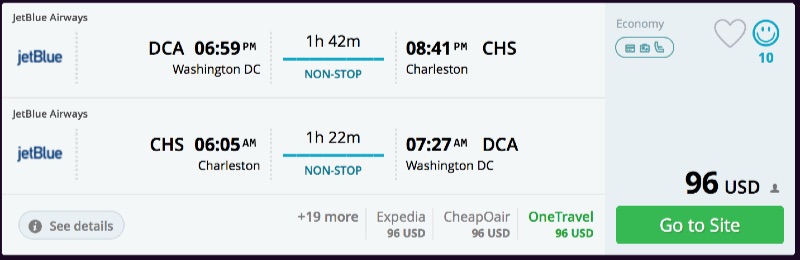 Amazing deal: Washington DC to Charleston, South Carolina and vice versa flights, roundtrip as low as $96.