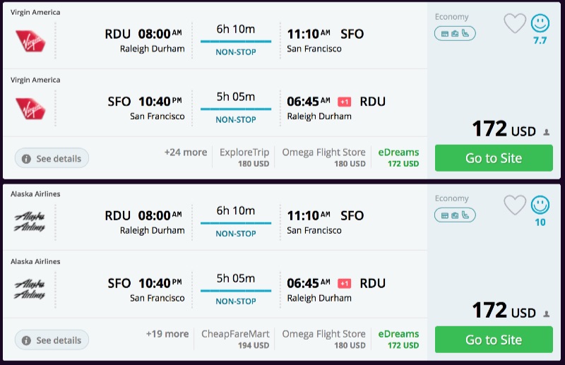 Raleigh to San Francisco and vice versa for $172 R/T nonstop [Alaska/Virgin America]