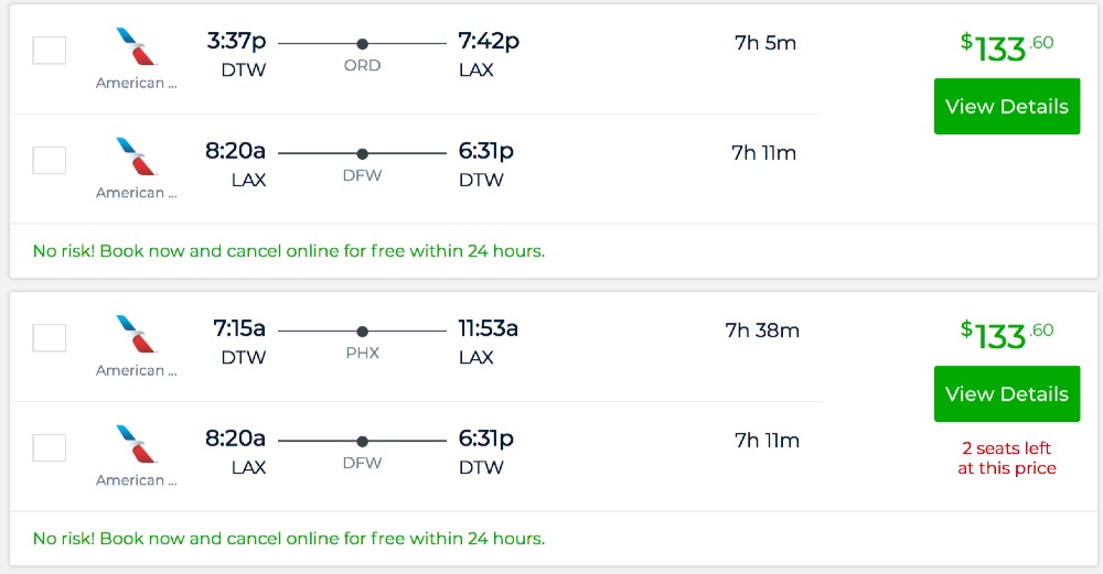 Detroit to Los Angeles and vice versa for $133 R/T [AA]