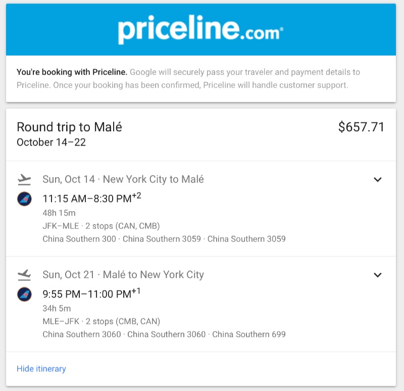 NOTE! Strangely that this fare cannot be searched directly via Priceline/Momondo. But Google Flights does show it and redirection to Priceline lands on passenger information/payment fill-in page with screen-shoted price point.