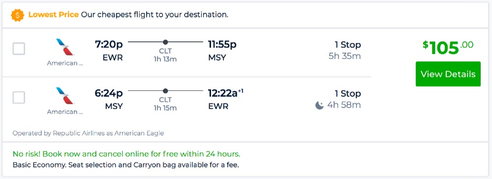 Newark to New Orleans and vice versa for $105 R/T [AA]
