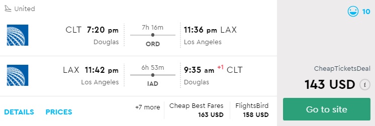 Charlotte to Los Angeles and vice versa for $143 R/T [United]