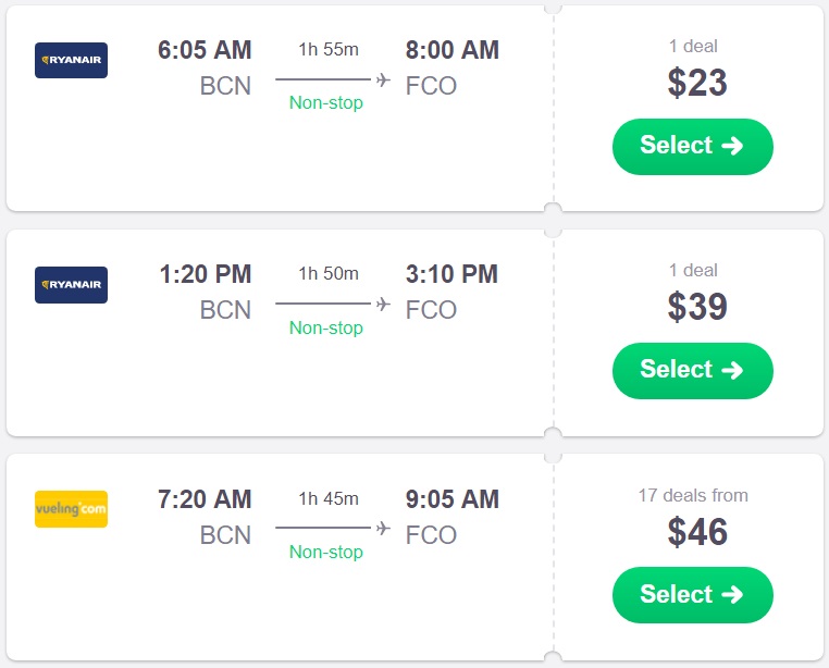 Barcelona to Rome from $20 O/W
