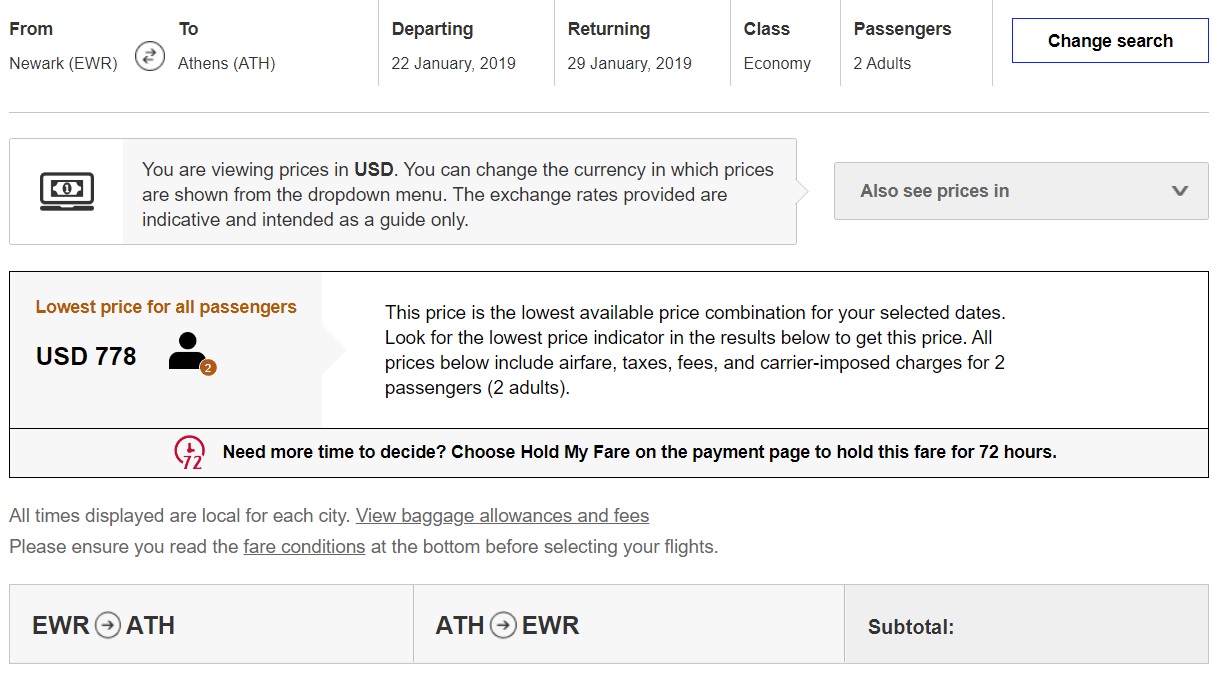 Travel period For EWR-ATH: October 28, 2018 through December 18, 2018 and December 26, 2018 through May 14, 2019