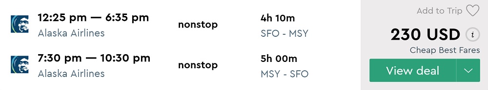 Amazing deal: San Francisco to New Orleans and vice versa flights round-trip as low as $230.