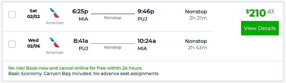 From MIA for $210 round-trip nonstop via AA