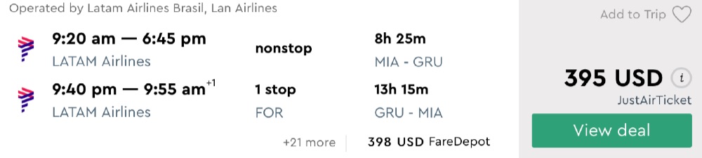Amazing deal: US Cities to Sao Paulo (Brazil) flight round-trip as low as $395.