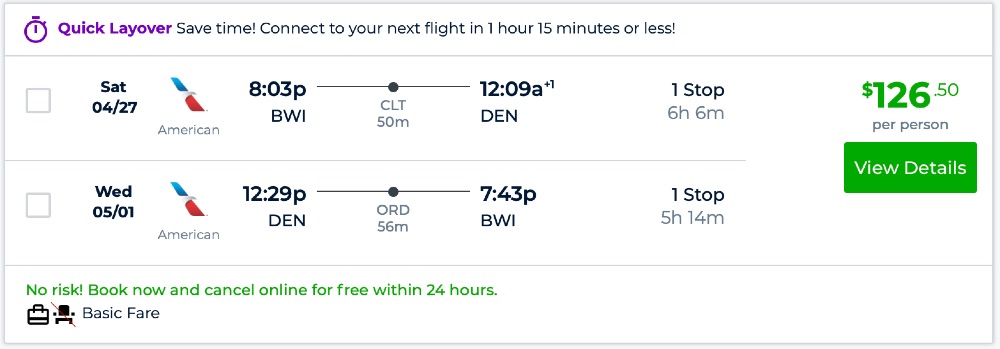 Amazing deal: Baltimore to Denver and vice versa flights round-trip as low as $126.