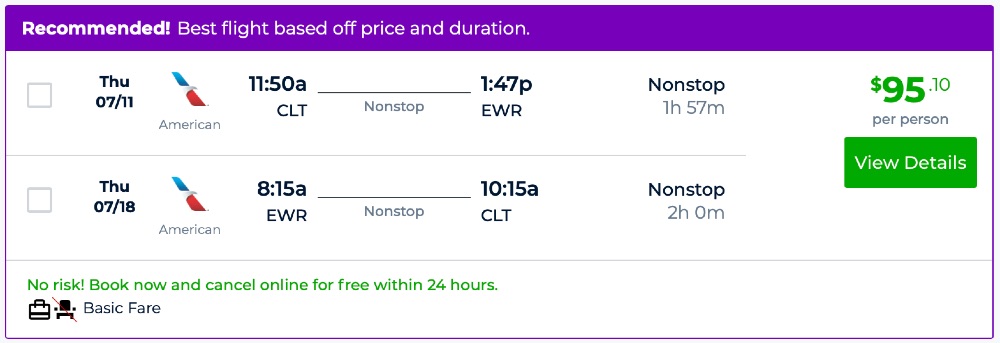 Amazing deal: Charlotte to Newark and vice versa flight roundtrip as low as $95.