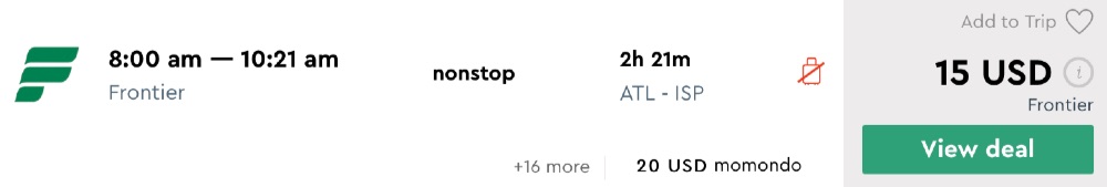 Atlanta to Islip, NY (Long Island) for $15 one-way nonstop