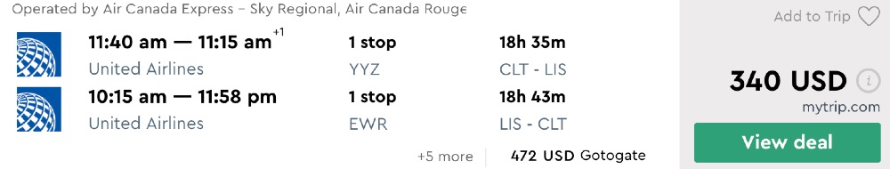 Amazing deal: Charlotte or Miami to Lisbon (Portugal) flight round-trip as low as $340.