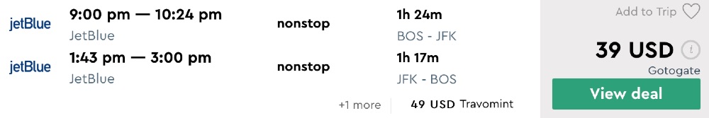 Boston to New York for $20 one-way ($39 round-trip) nonstop