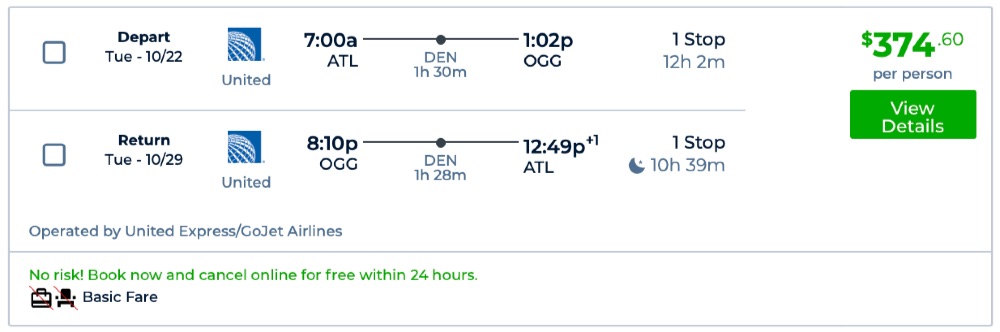 Amazing deal: Atlanta to Hawaii: Kahului (Maui) and vice versa flight round-trip as low as $375.