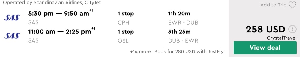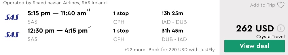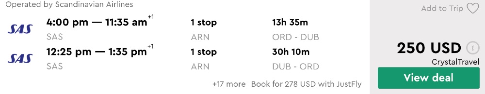 Amazing deal: Newark, Chicago or Washington DC to Dublin, Ireland flight round-trip as low as $250.