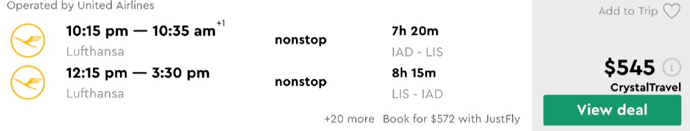 RARE FARE! Nonstop! Washington DC to Lisbon, Portugal for $545 round-trip