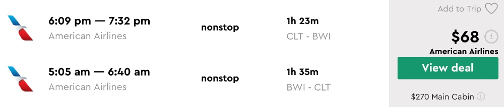 Amazing deal: Charlotte – Baltimore and vice versa flight round-trip as low as $68.