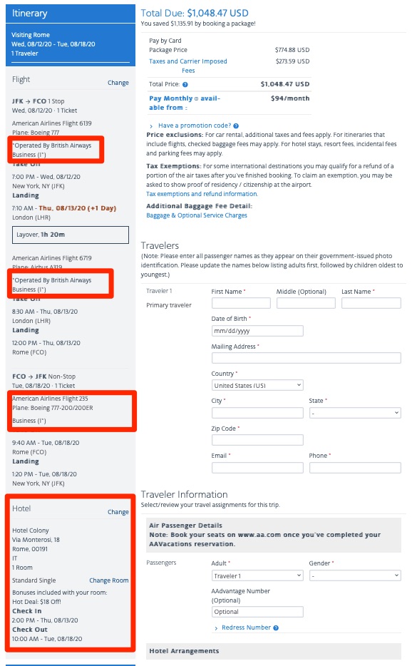 Example: New York to Rome in business class flight + hotel for 6 nights in August 2020.