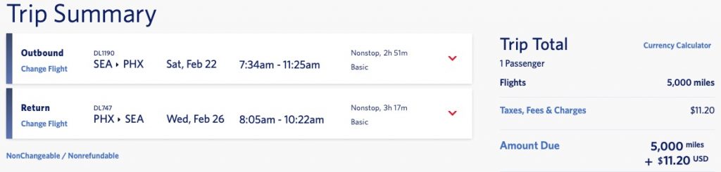 Delta’s Award Travel is subject to government-imposed taxes and fees and carrier-imposed charges, which are the responsibility of the passenger and must be paid at the time the ticket is booked. Taxes/fees/carrier-imposed charges depend upon the itinerary and will be $11.20 round-trip for Main Cabin travel within the contiguous U.S. 48. Award Seats are limited and may not be available on all flights or in all markets.