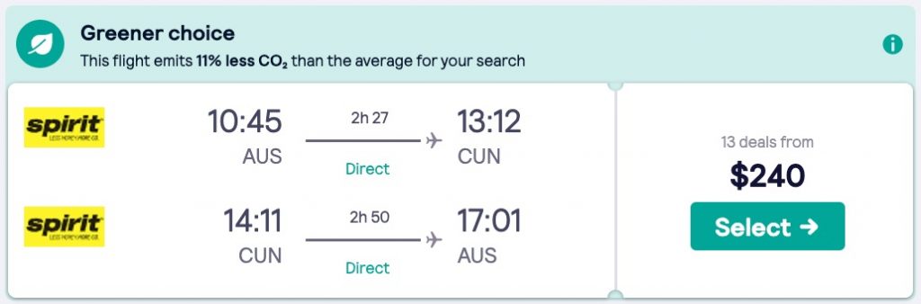 Note, that Spirit Airlines is a low-coster and have luggage fees. Considering, that Southwest (another carrier with nonstop service to Cancun) charges at least $400-500 for round-trip to the same destination — Spirit may be a good alternative.