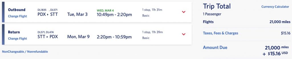 Portland, OR to St. Thomas, VI Travel Period starts 03/01/2020 and ends 03/09/2020