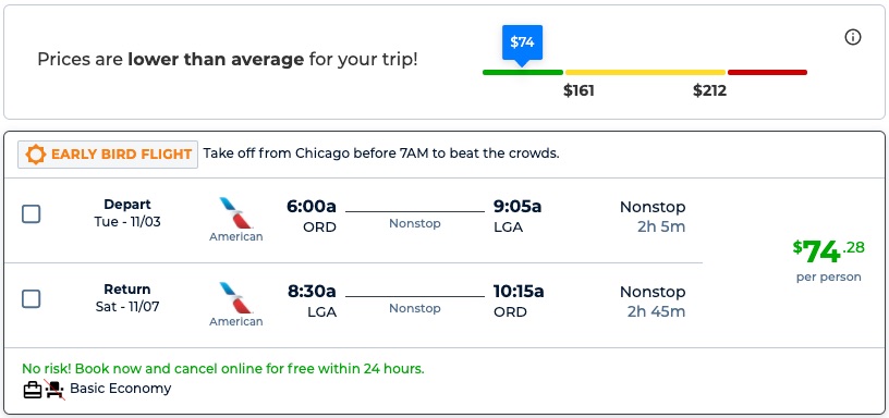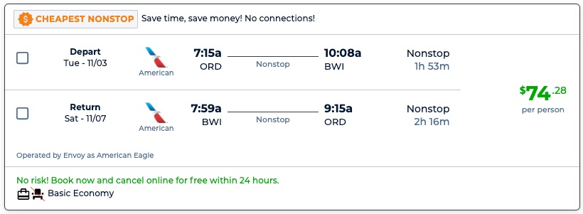 Amazing deal: Chicago to New York or Baltimore and vice versa flight roundtrip as low as $74.