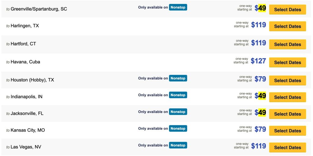 Fares valid on nonstop service where indicated; if not indicated, fares are valid on single connecting service.