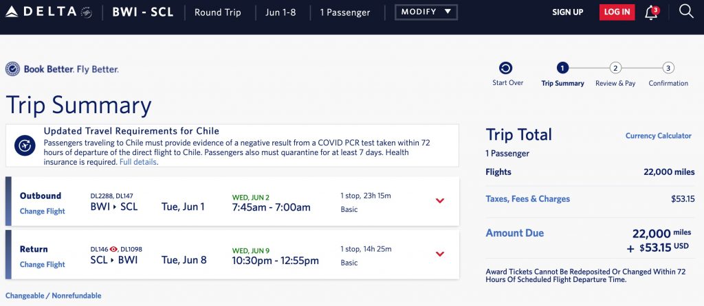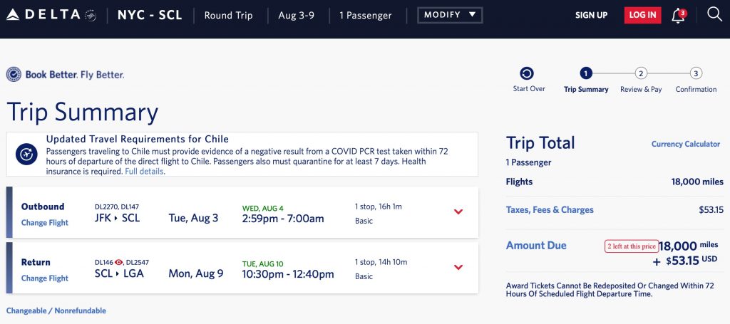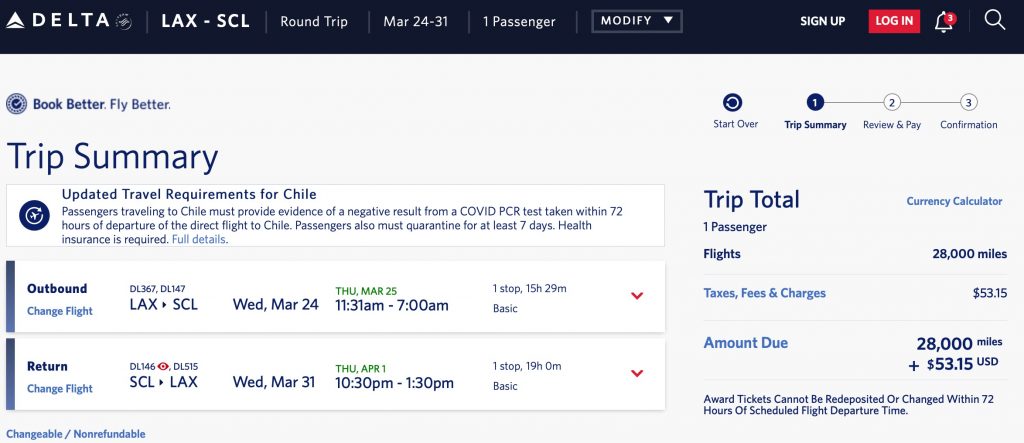 Amazing award travel deals via Delta — round-trip flights via Delta to Chile: Santiago from 18000 miles + taxes and fees.