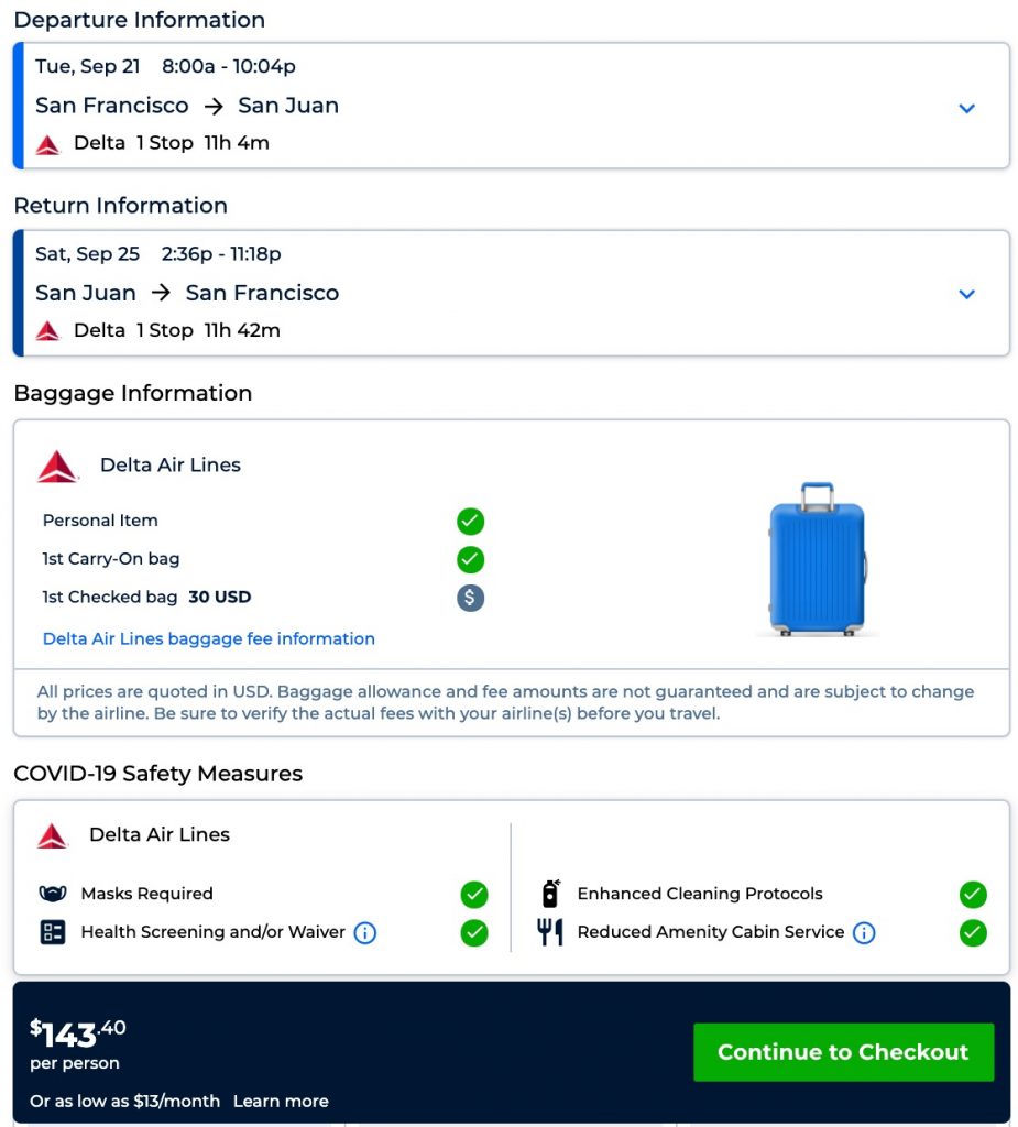 | Delta | San Francisco to Puerto Rico (San Juan) for $143 R/T