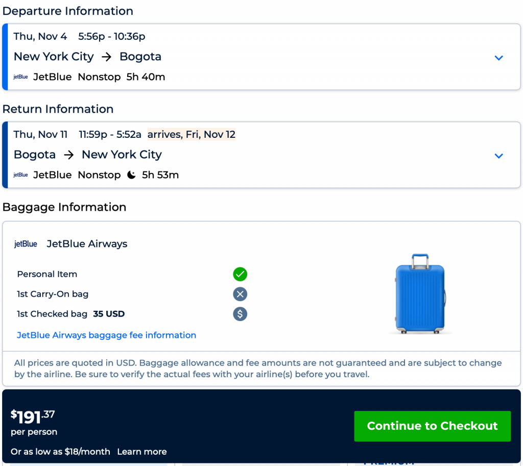 | jetBlue; nonstop | New York to Bogota, Colombia for $191 R/T