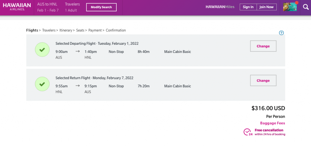 screenshot courtesy of HawiianAirlines.com made on Dec 14, 2021