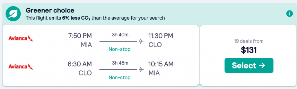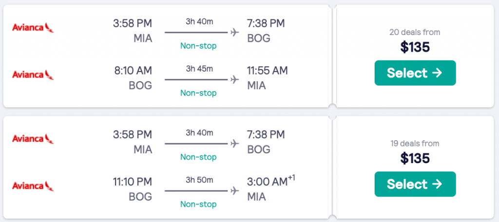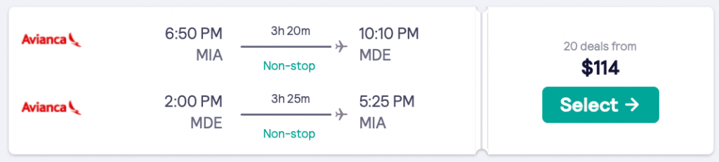| Avianca; nonstop | Miami to Colombia: Bogota, Medellin, Cali from $114 R/T