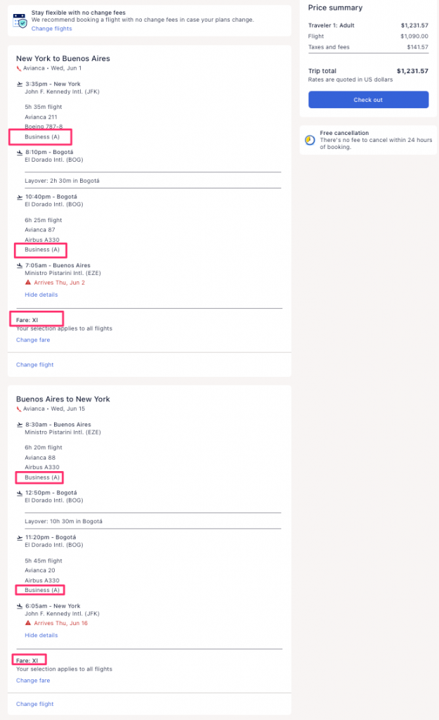 | Business Class | New York to Buenos Aires, Argentina for $1231 R/T