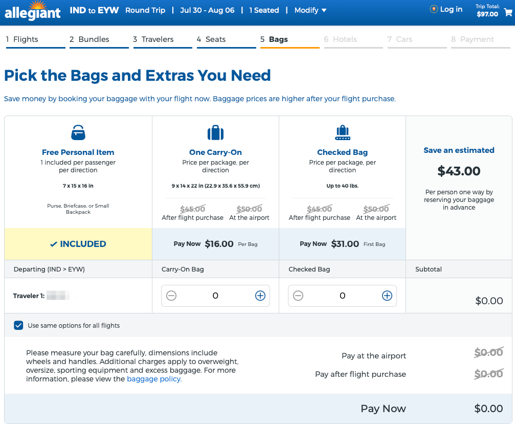 Note, that Allegiant is budget airline and has optional fees: baggage, seat selection etc.