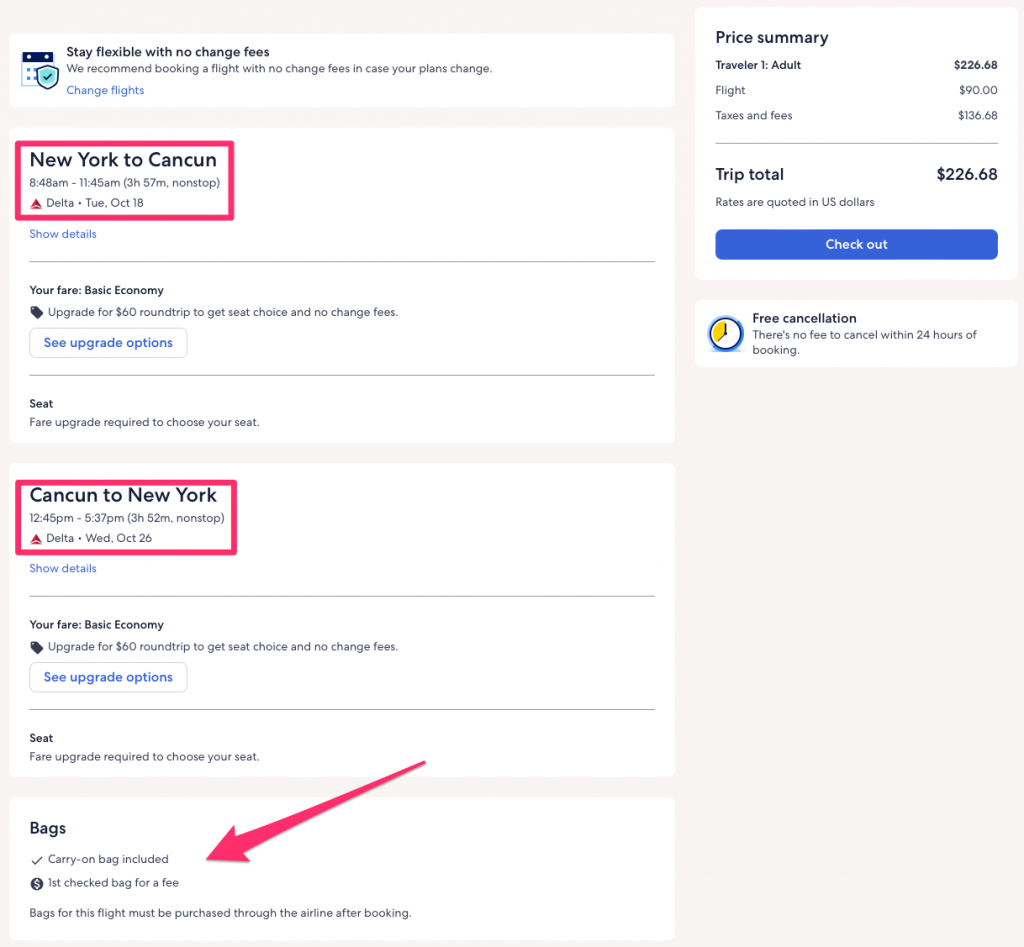 Screenshot made at Delta.com on 8/11/22.