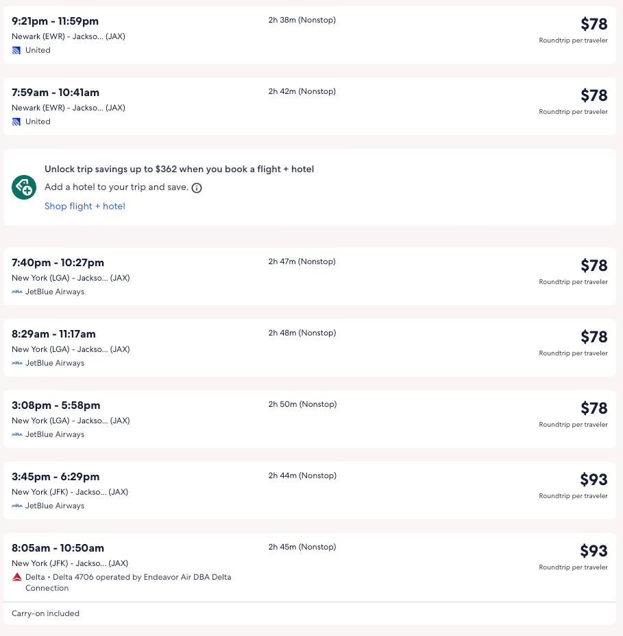 Amazing deal: New York/Newark to Jacksonville, FL from $78 round-trip.