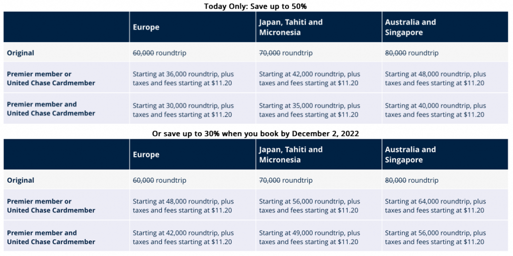 Premier® members and United Chase Cardmembers save on economy award fares to destinations across Europe, Australia or Asia. (Premier members and Cardmembers save up to 40% on award travel on Cyber Monday (Nov 28, 2022). Premier members who are also Cardmembers save up to 50% on Cyber Monday.)