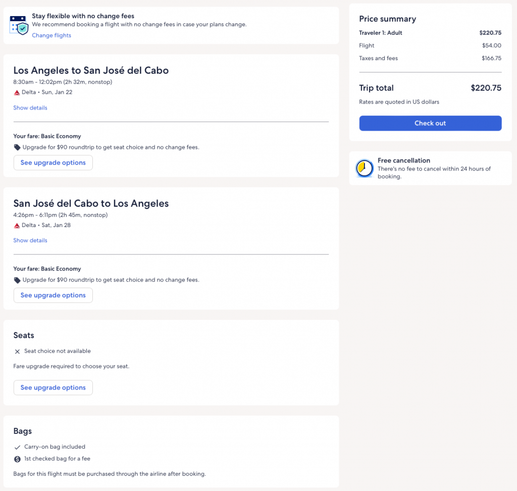 Screenshot from Delta.com, made on 12/20/22
