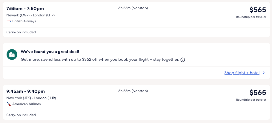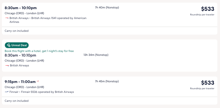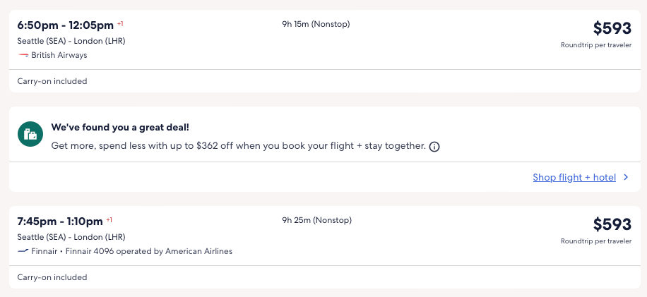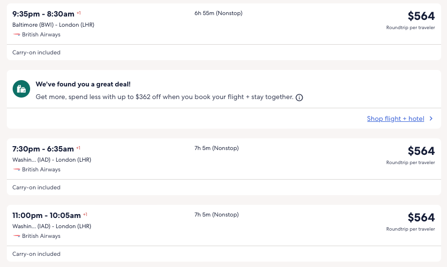 Discounted flights from New York, Newark, Washington DC, Baltimore, Boston, Chicago, Seattle to London, UK from $533 round-trip.