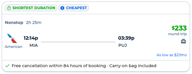 Discounted flights from Miami to Punta Cana, Dominican Republic from $233 round-trip.
