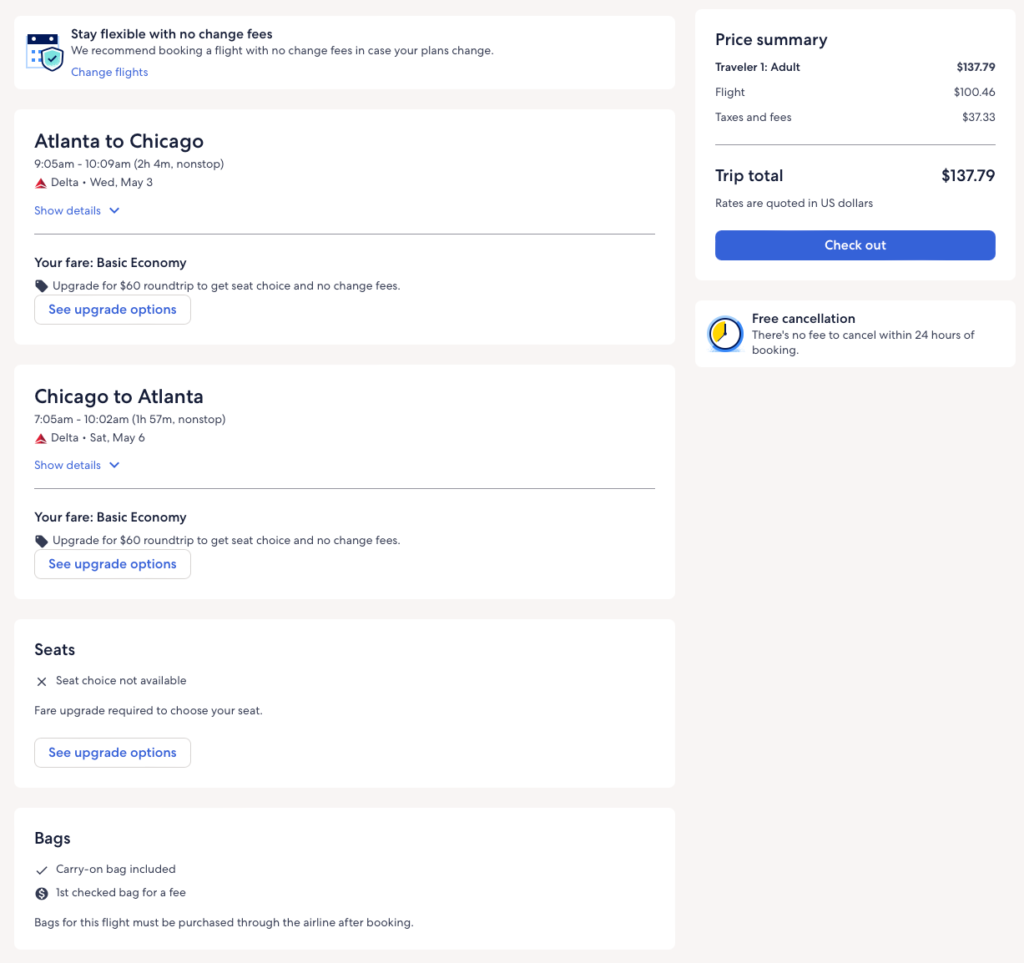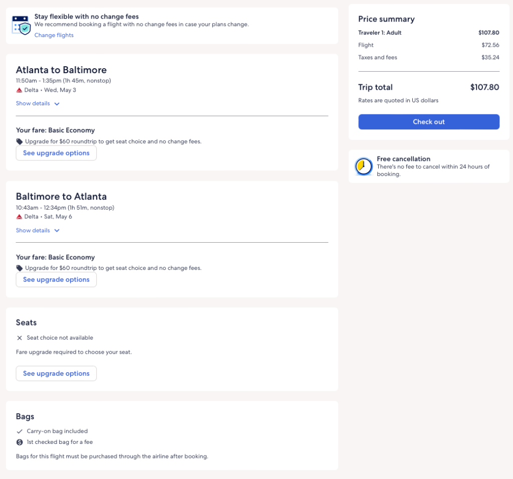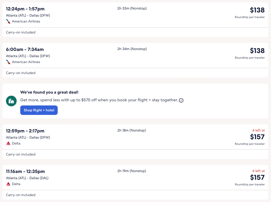 Discounted flights from Atlanta to New Orleans, Fort Lauderdale, Miami, Baltimore, New York, Newark, Boston, Cleveland, Detroit, Chicago, Dallas from $98 round-trip.