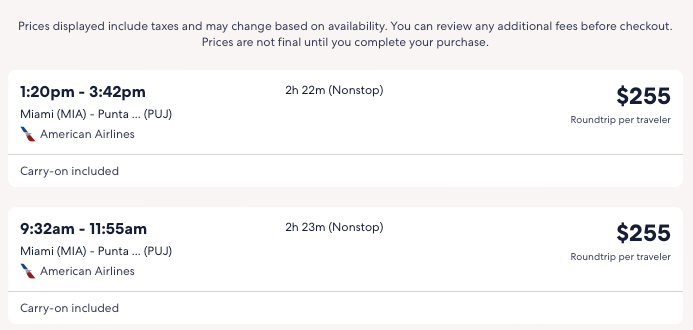 Discounted flights from Miami to Punta Cana, Dominican Republic from $255 round-trip.