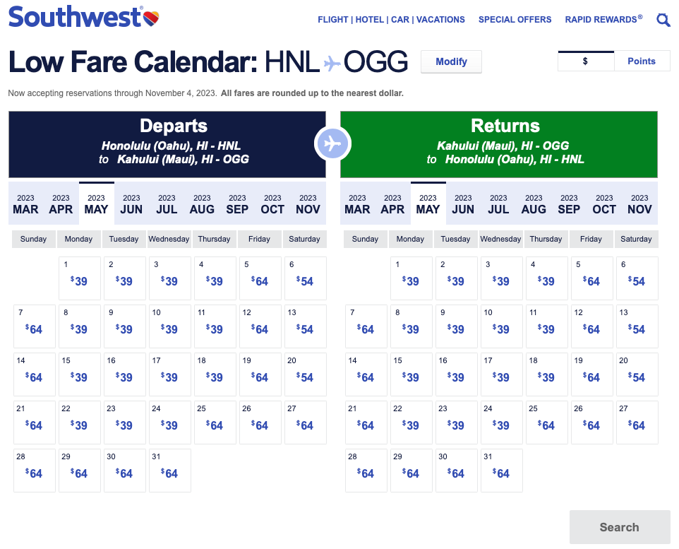Continental U.S. travel valid March 21 through May 17, 2023. Travel continental U.S. to/from Hawaii valid April 11 through May 17, 2023. Interisland Hawaii travel valid March 21 through May 17, 2023. Travel to/from San Juan, Puerto Rico valid April 11 through May 17, 2023. International travel valid April 11 through May 17, 2023.