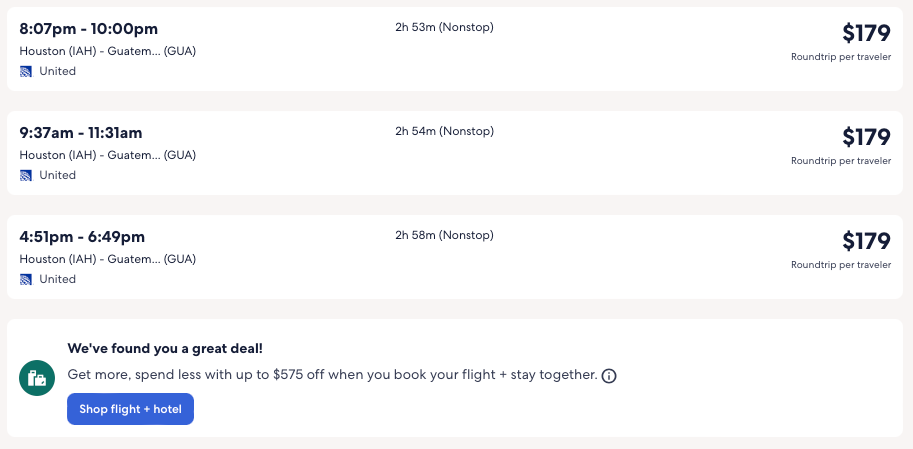 Discounted flights from Houston to Guatemala from $179 round-trip.