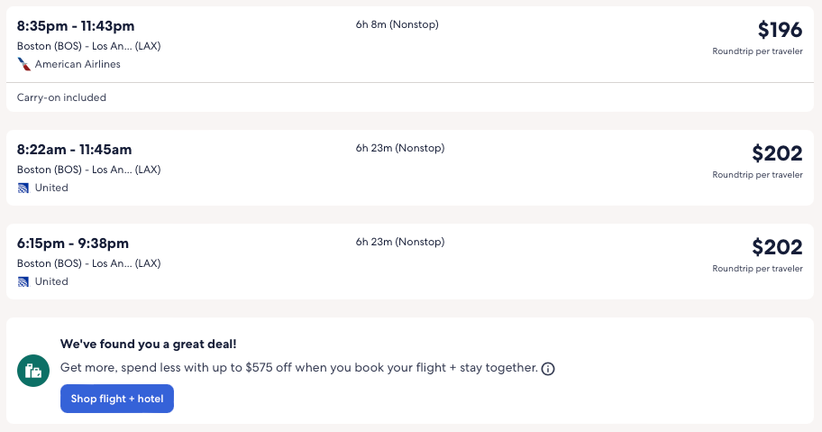 Discounted flights from Boston to LA and v/versa from $196 round-trip.