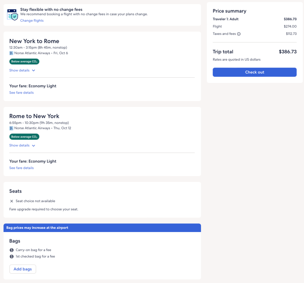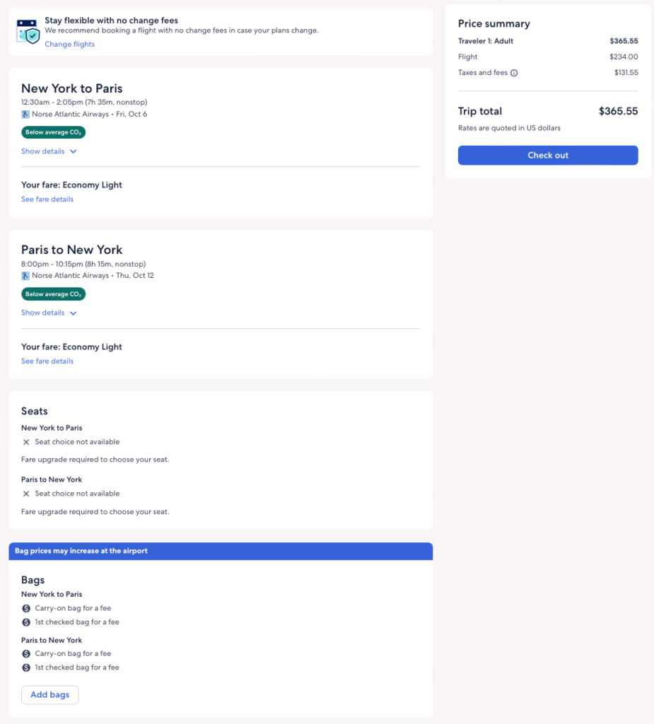 Note, that Norse is a budget carrier with optional fees: baggage, seat selection etc.